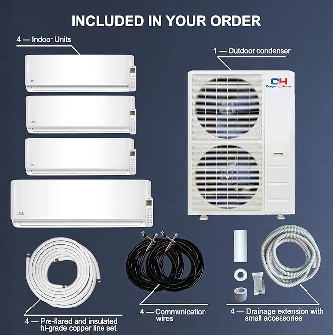 Included Components‎‎Indoor Wall Mount Units, Outdoor Condenser, Installation Kits, and Small Accessories.