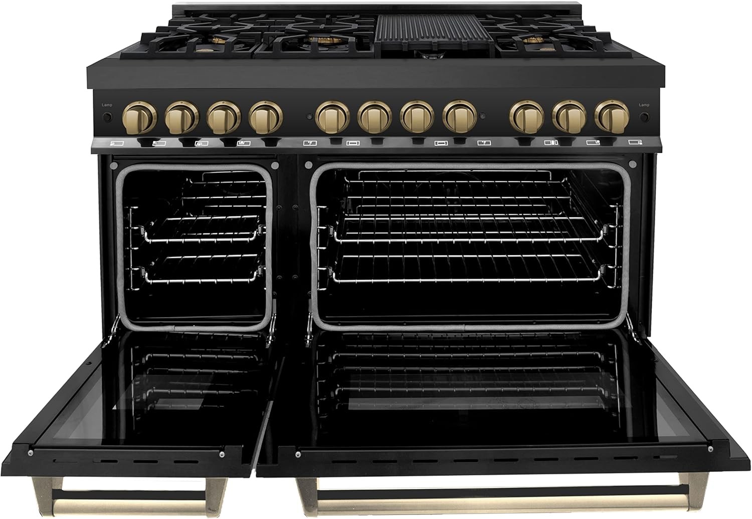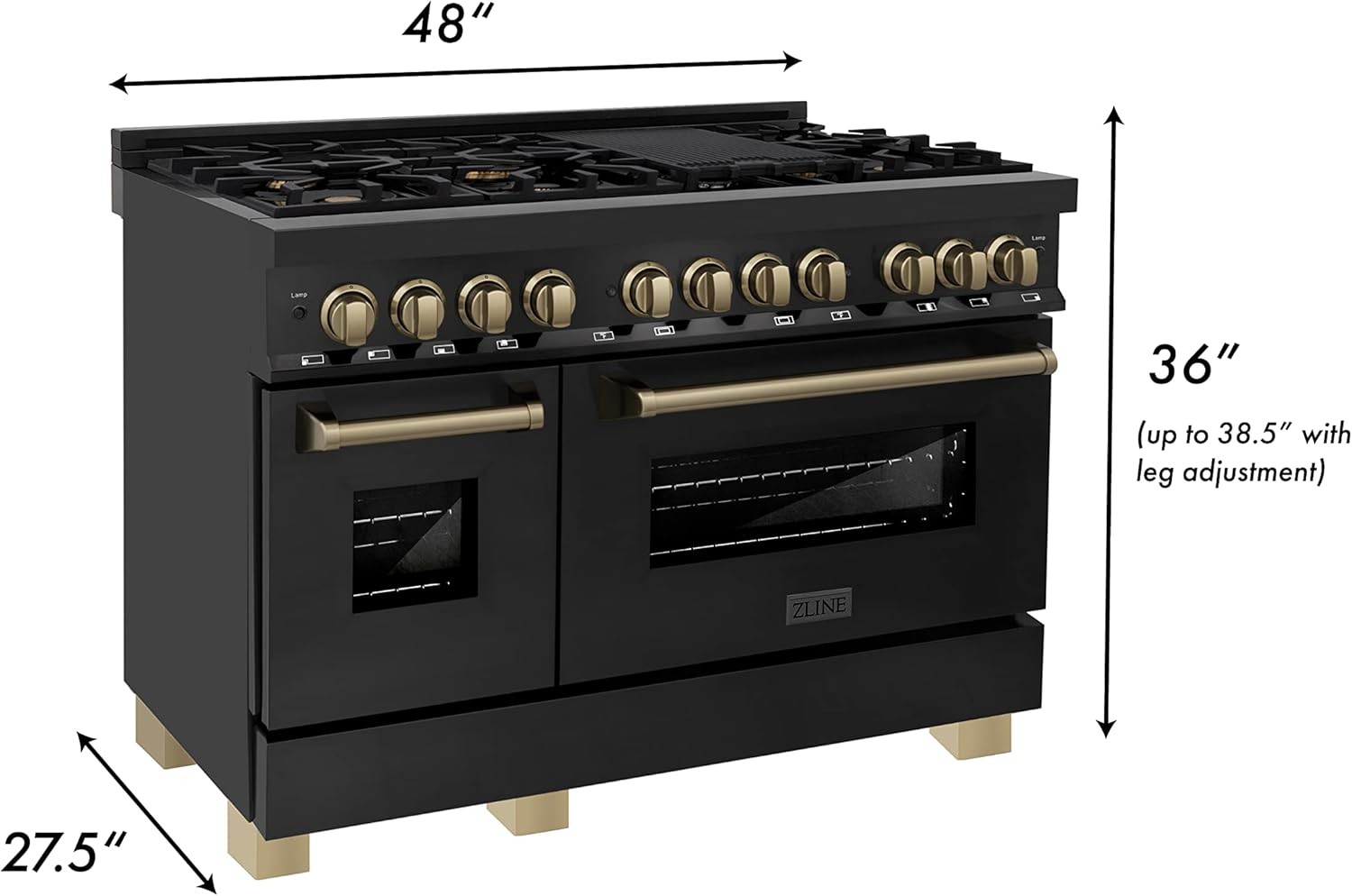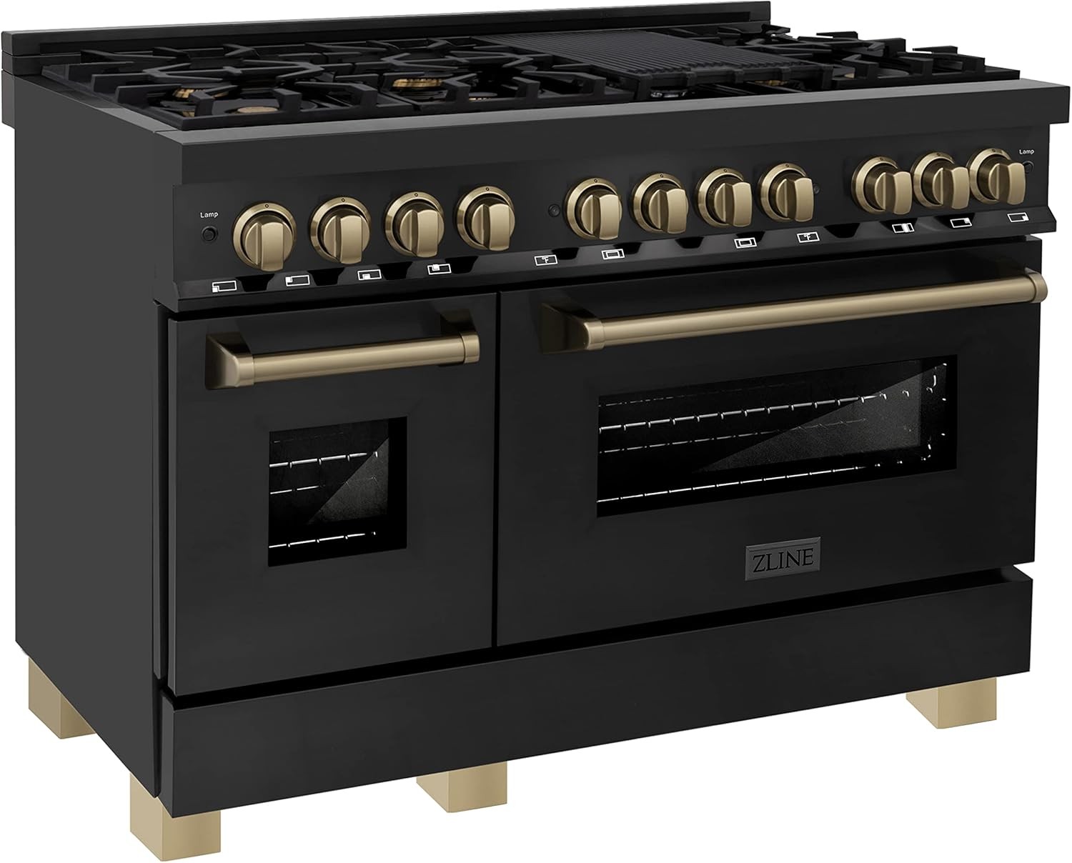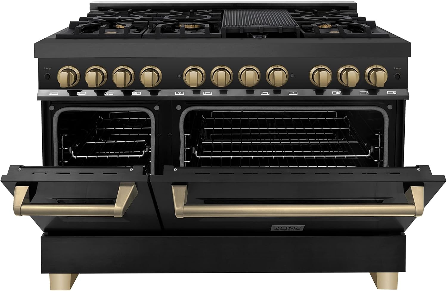 ZLINE Autograph Edition 48 in. 6.0 cu. ft. Legacy Dual Fuel Range with 7 Burner Gas Cooktop and 2 Electric Ovens in Black Stainless Steel and Champagne Bronze Accents (RABZ-48-CB)